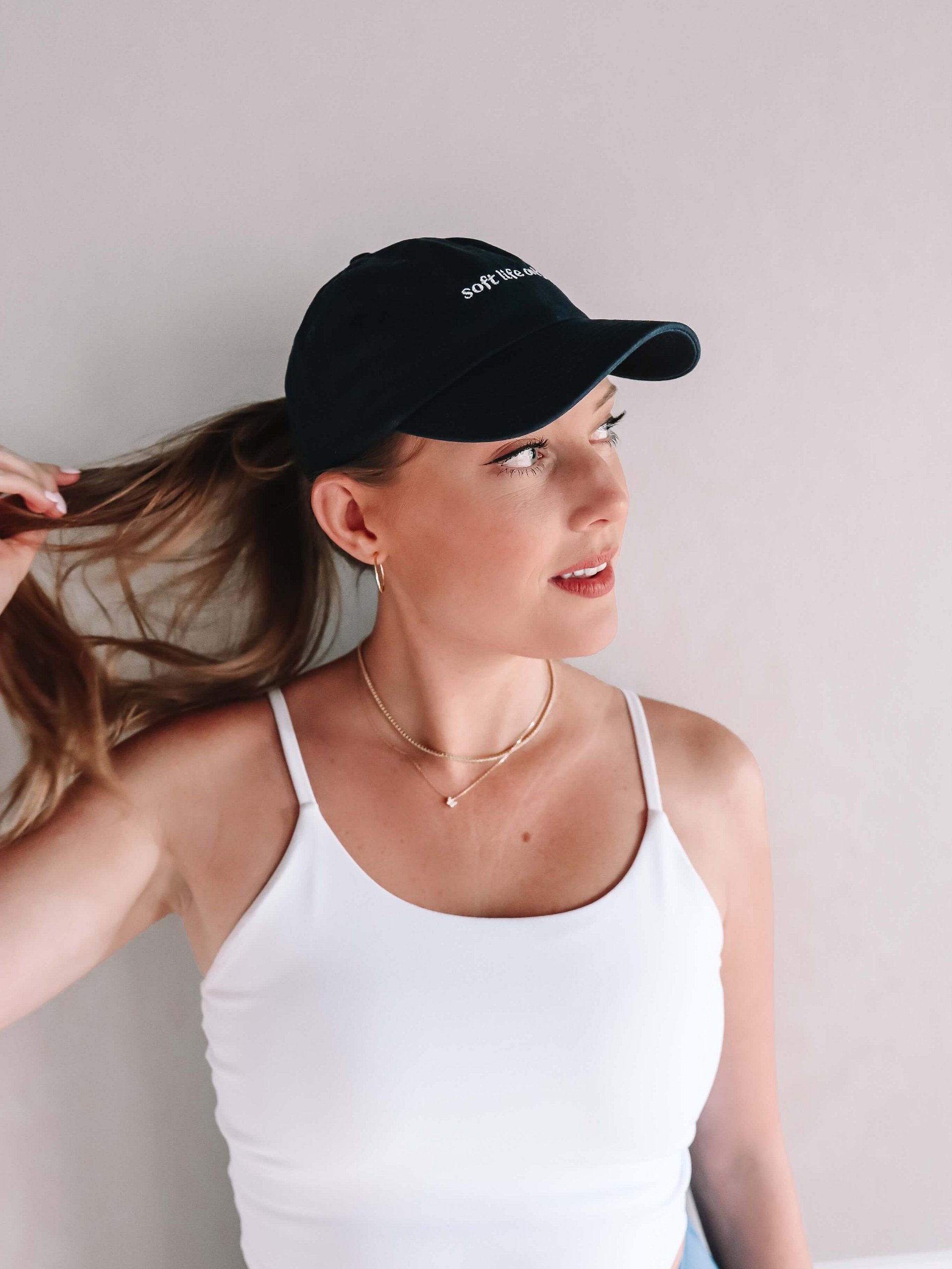 The phrase "soft life only" is threaded into the hat for a high-quality, subtle, vintage look.